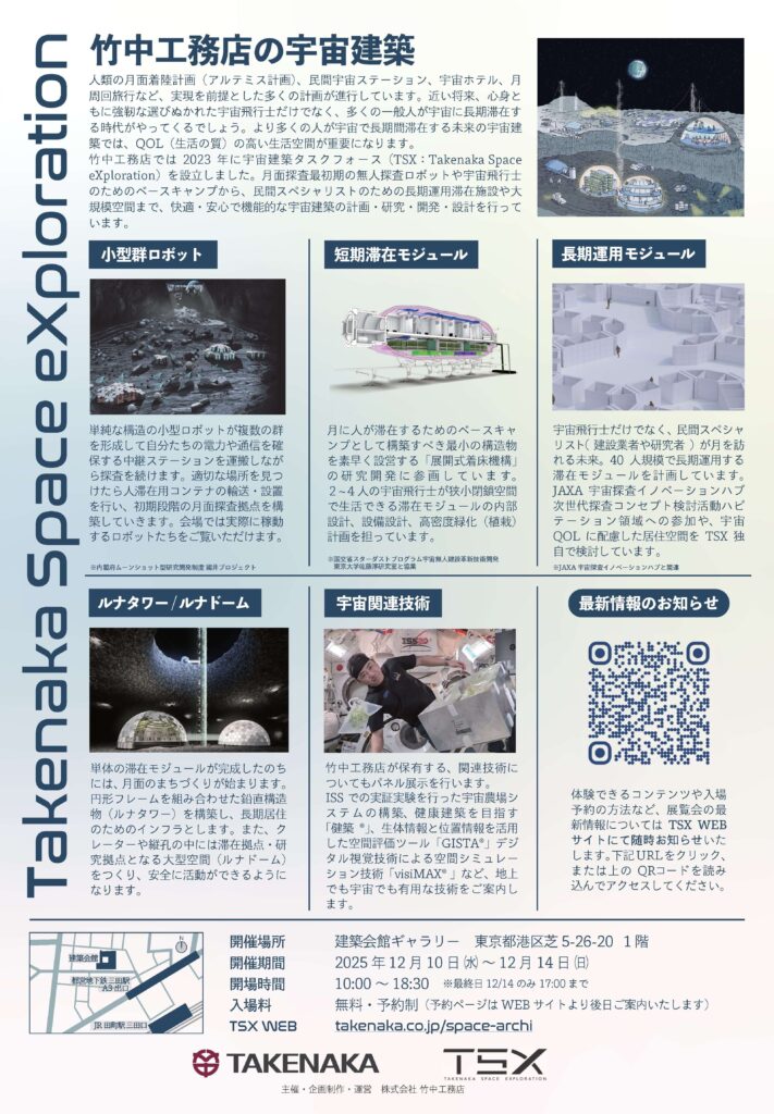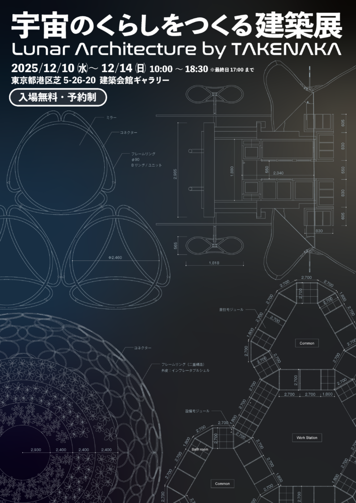 TAKENAKA Corporation will hold the “Lunar Architecture by TAKENAKA” exhibition at the Architectural Institute of Japan Gallery in Minato city, Tokyo, from December 10th to December 14th, 2025. TAKENAKA has joined the MS KUNII project. At the exhibition, visitors can see the AI swarm exploration robots in operation.