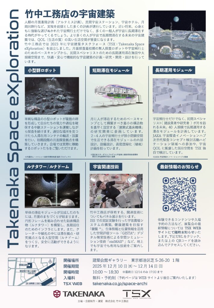 本PJに参加している竹中工務店は、2025年12月10日(水)より12月14日(日)まで「宇宙のくらしをつくる建築展/Lunar Architecture by TAKENAKA」を東京都港区の建築会館ギャラリーにて開催します。本PJの会場では実際に稼動するAI群探査ロボットたちをご覧いただけます。